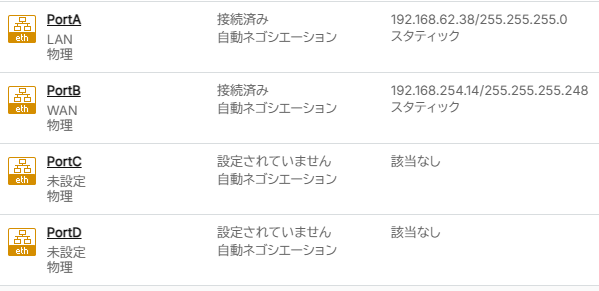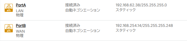 ※想定通りnet0がPortA(LAN)、net1がPortB(WAN)として判定された。