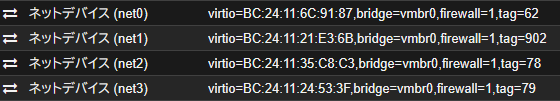vmbr0はVLAN awareを有効化しており各VMでvlanタグを設定してる。